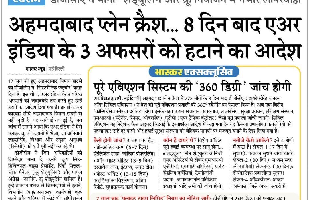 अहमदाबाद हादसे के बाद DGCA ने शनिवार को एअर इंडिया को 3 अफसरों को हटाने का आदेश दिया। इनमें डिविजिनल वाइस प्रेसिडेंट चूड़ा सिंह, क्रू शेड्यूलिंग करने वाली चीफ मैनेजर पिंकी मित्तल और क्रू शेड्यूलिंग की प्लॉनिंग से जुड़ी पायल अरोड़ा शामिल हैं