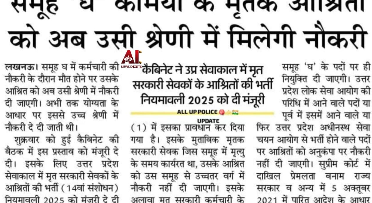 उत्तर प्रदेश सरकार ने “उत्तर प्रदेश सेवाकाल में मृत सरकारी सेवकों की भर्ती (14वां संशोधन) नियमावली 2025” को मंजूरी दी है, जिसमें अब मृतक कर्मचारी के सहयोगी को उसकी मृत्यु के समय मौजूद समूह (जैसे ग्रुप ‘जी’) की श्रेणी में ही नौकरी दी जाएगी, न कि योग्यता के आधार पर उच्च श्रेणी में। यह नियम नियमावली के नियम 5 (1) में शामिल किया गया है, और यह मृतक कर्मचारी के आश्रितों को केवल ग्रुप ‘जी’ और ‘घ’ के पदों पर ही नौकरी के लिए सलाह देने का भी प्रावधान करता है।