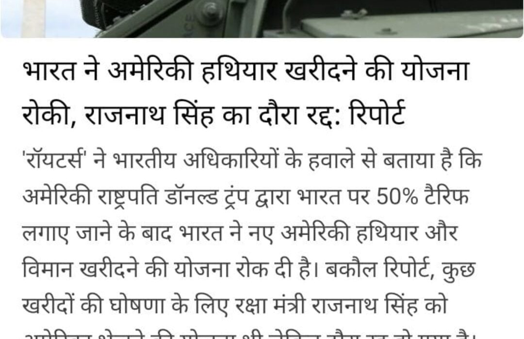 रॉयटर्स’ ने भारतीय अधिकारियों के हवाले से बताया है कि अमेरिकी राष्ट्रपति डॉनल्ड ट्रंप द्वारा भारत पर 50% टैरिफ लगाए जाने के बाद भारत ने नए अमेरिकी हथियार और विमान खरीदने की योजना रोक दी है। बकौल रिपोर्ट, कुछ खरीदों की घोषणा के लिए रक्षा मंत्री राजनाथ सिंह को अमेरिका भेजने की योजना थी लेकिन दौरा रद्द हो गया है।