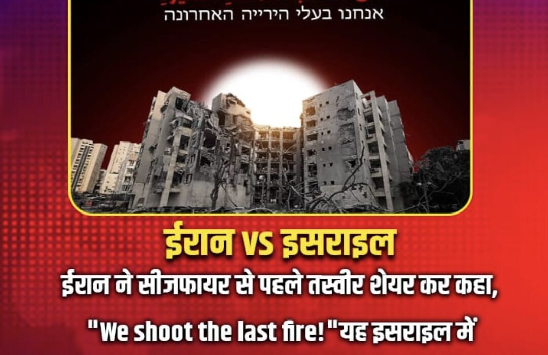 ईरान ने स्वीकार किया सीजफायरईरान ने सीजफायर से पहले तस्वीर शेयर कर कहा, “We shoot the last fire!”यह इसराइल में ‘Beersheva’ की एक बिल्डिंग है, जिस पर ईरान ने अपना आखिरी हमला कर सीजफायर लागू किया।