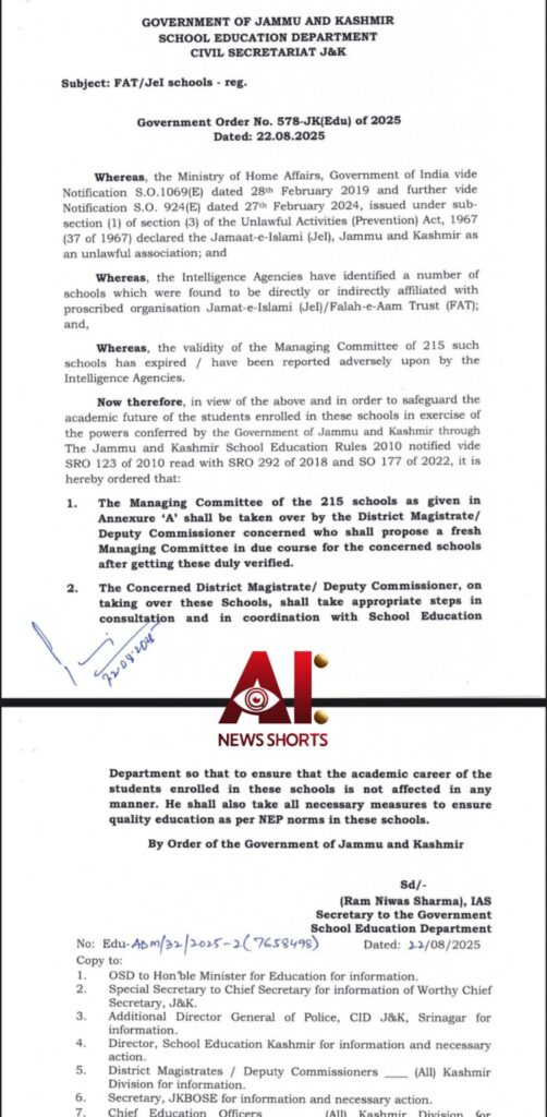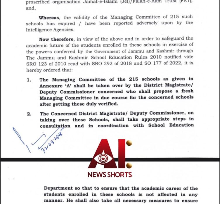J&K सरकार ने 215 स्कूलों की प्रबंधन समितियां भंग कर दी हैं। ये सभी स्कूल प्रतिबंधित जमात-ए-इस्लामी और उसके शिक्षा विभाग फलाह-ए-आम ट्रस्ट (FAT) से जुडे पाए गए। खुफिया एजेंसियों की रिपोर्ट के बाद सरकार ने इन स्कूलों का नियंत्रण अपने हाथ में ले लिया है। अब डिप्टी कमिश्नर इनका प्रबंधन संभालेंगे और यह सुनिश्चित करेंगे कि छात्रों की पढ़ाई प्रभावित न हो।