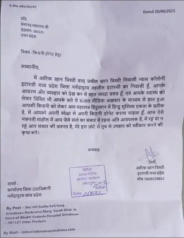 उत्तर प्रदेश के नालंदा पुरम जिले के इटारसी में रहने वाले एक मुस्लिम युवक ने संत प्रेमानंद महाराज को किडनी डोनेट करने की इच्छा जताई है। उसने नॉर्वे के नाम पर एक पत्र लिखा है। इसमें उन्होंने कहा कि उन्हें सोशल मीडिया पर पता चला कि महाराज जी की दोनों किडनियां फेल हैं। इसलिए वह उनके स्वास्थ्य को लेकर काफी चिंतित हैं।