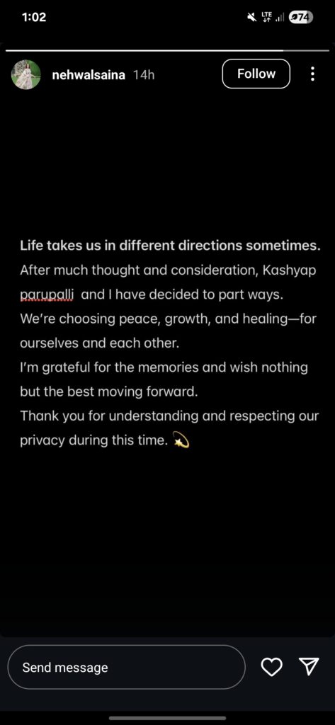 भारतीय बैडमिंटन स्टार और ओलंपिक मेडलिस्ट सायना नेहवाल और उनके पति परुपल्ली कश्यप ने एक-दूसरे से अलग होने का फैसला लिया हैं। सायना और कश्यप ने लंबे रिलेशनशिप के बाद 14 दिसंबर 2018 को शादी की थी। अब सात साल बाद दोनों का यह रिश्ता टूटने वाला है। सायना ने एक सोशल मीडिया पोस्ट के जरिये कश्यप से अलग होने के फैसले को सार्जवनिक किया।