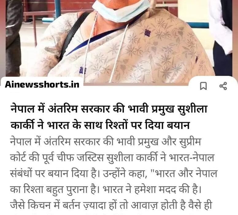नेपाल में अंतरिम सरकार की भावी प्रमुख और सुप्रीम कोर्ट की पूर्व चीफ जस्टिस सुशीला कार्की ने भारत-नेपाल संबंधों पर बयान दिया है। उन्होंने कहा, “भारत और नेपाल का रिश्ता बहुत पुराना है। भारत ने हमेशा मदद की है। जैसे किचन में बर्तन ज़्यादा हों तो आवाज़ होती हे वैसे ही बीच-बीच में खटपट होती है लेकिन रिश्ता मज़बूत है।”