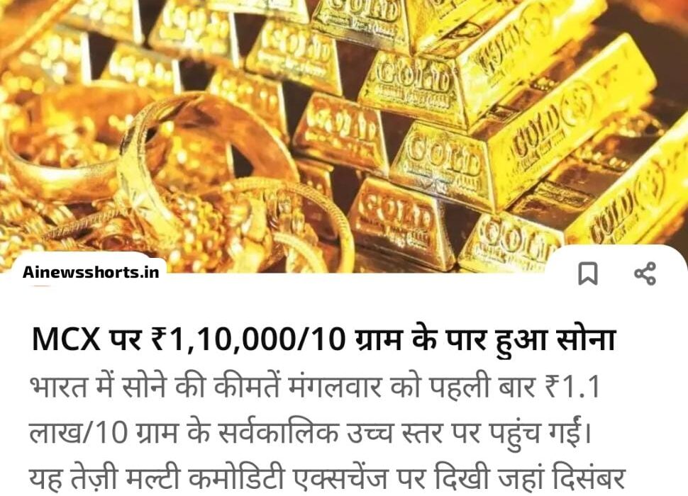 भारत में सोने की कीमतें मंगलवार को पहली बार ₹1.1 लाख/10 ग्राम के सर्वकालिक उच्च स्तर पर पहुंच गई। यह तेज़ी मल्टी कमोडिटी एक्सचेंज पर दिखी जहां दिसंबर में डिलीवरी वाले सोने का वायदा भाव ₹458 या 0.41% बढ़कर ₹1,10,047/10 ग्राम पर पहुंच गया। अक्टूबर कॉन्ट्रैक्ट भी ₹482 की बढ़त के साथ ₹1,09,000/10 ग्राम के नए शिखर पर पहुंच गया।